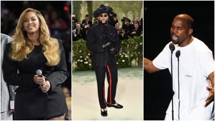 Posicionamento político de famosos tem sido decisivo para estimular eleitores a votar em candidatos a presidência; veja lista. (Da esq. p/ dir.) Os cantores Beyoncé, Bad Bunny e Kanye West