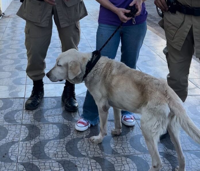 A Polícia Militar (PM) foi chamada para ajudar no resgate, que aconteceu na quinta-feira (25). O cachorro estaria há varias dias naquela condição e a responsável por uma ong da cidade chamou a equipe.