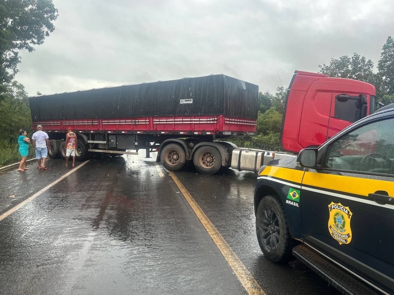 A PRF informou que a batida teria sido frontal. A carreta ficou atravessada na rodovia e o carro caiu na ribanceira. A causa do acidente ainda deve ser investigada.