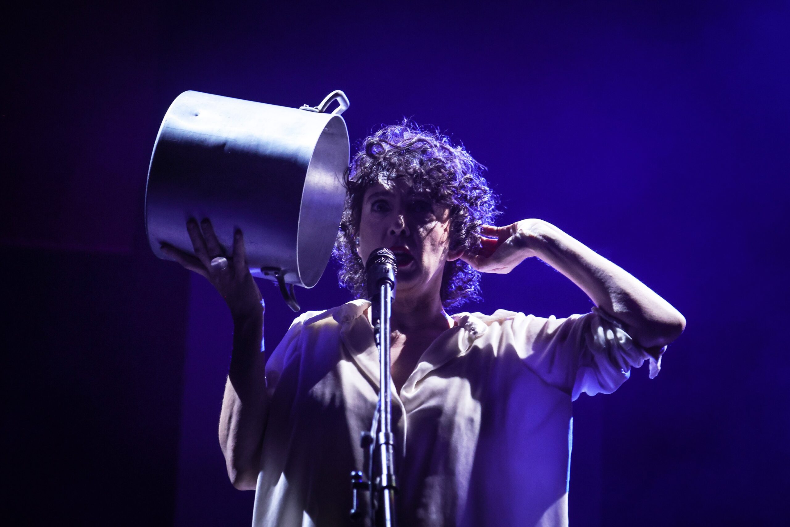 ♪ Foi com panela colada ao ouvido direito que Adriana Calcanhotto entrou em cena no show Gal – Coisas sagradas permanecem para cantar, sob penumbra, Recanto escuro (Caetano Veloso, 2011), música que norteou álbum revigorante na discografia de Gal Costa, cantora morta em novembro e homenageada postumamente neste tributo que chegou à cidade do Rio de Janeiro (RJ) na noite de ontem, 29 de abril, dois dias após estrear em Porto Alegre (RS), terra natal de Calcanhotto.