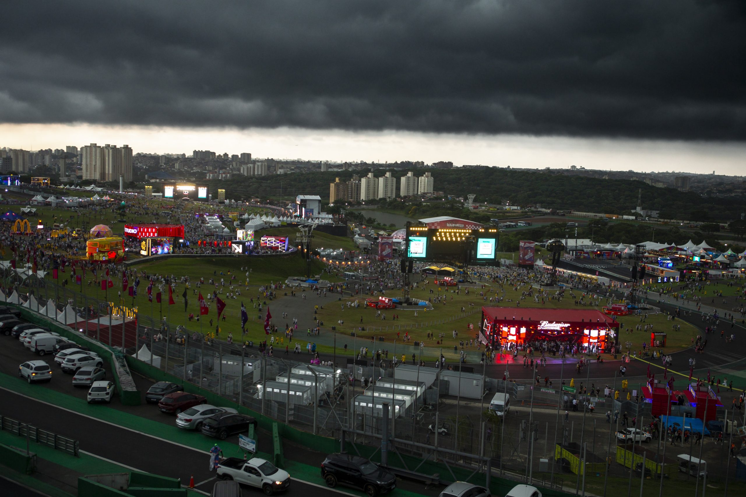 A forte chuva que atingiu São Paulo nesta sexta-feira (28) fez com que o dia “virasse” noite no Lollapalooza 2025. O show de MC Kako foi interrompido por risco de raios, e a produção pediu que o público no local se afastasse das estruturas metálicas.