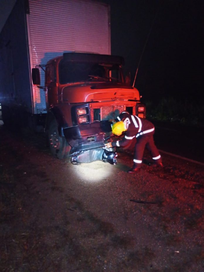 Vítima de 20 anos foi encontrada ao lado da via. Motorista foi ouvido na 9ª Central de Atendimento da Polícia Civil e liberado em seguida. Moto da vítima foi parar embaixo de caminhão