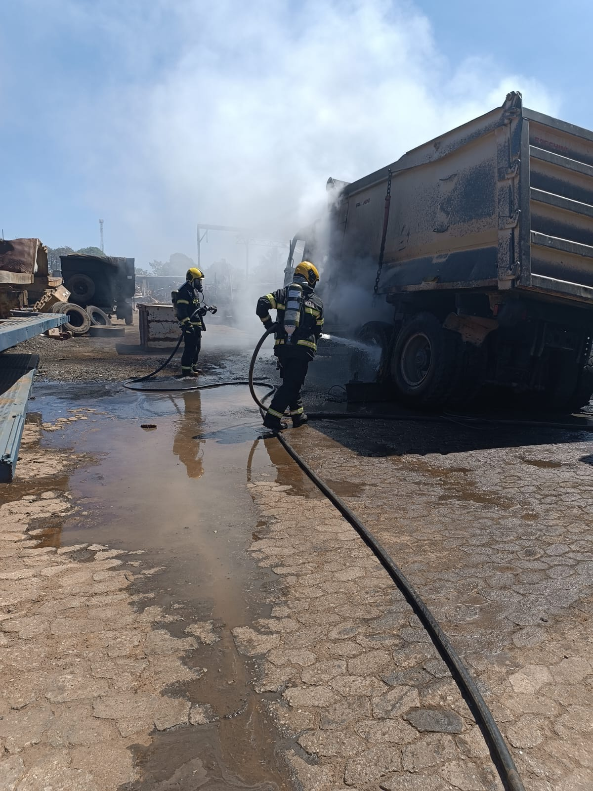 Os bombeiros foram chamados para conter o fogo, que começou no motor e tomou grande parte do veículo na sexta-feira (26). As chamas produziram grande quantidade de uma fumaça preta e densa no local e destruíram a cabine.