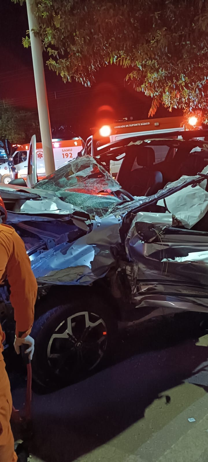 Acidente aconteceu próximo de rotatória em frente a Feira da 304 Sul. Vítima foi identificada como André Rodrigues Duarte, de 38 anos. Carro da vítima ficou destruído após impacto