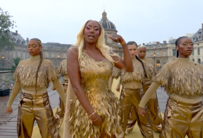 Cantora franco-maliana é dona do hit “Djadja”, que bombou na Copa do Mundo de 2018. Aya Nakamura em cerimônia de abertura dos Jogos Olímpicos 2024
